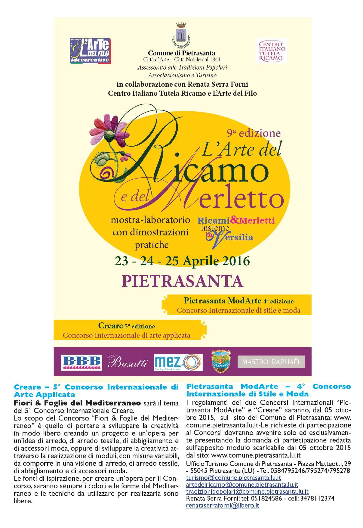 Esta novena edición, que cuenta, entre otras, con la colaboración del Centro Italiano de la Protección del Bordado, acogerá, de igual modo, conferencias especializadas y talleres con la intervención de los principales monitores y alumnos de dichas escuelas. Como acto principal destaca la convocatoria del concurso de estilo y moda, ‘Modarte’, en su cuarta edición, que está reservado a estilistas y escuelas de moda.