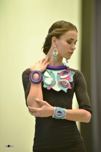 La siguiente en subierse a la pasarela fue Artaps, con sus joyas realizadas con plástico reciclado para esta ocasión. Mostró tres colecciones con un denominador común: el plástico reciclado, pero con un diseño y concepción radicalmente distinto. La primera de ellas, ‘Gaudí’, es una colección inspirada en los mosaicos del artista, concretamente, en el trencadis, una línea realizada con cd’s reciclados trabajados de tal forma que con la carátula de los mismos he conseguido una cuadrícula parecida al famoso trencadis del artista catalán. Además, llevan soldadas pequeñas piezas de estaño repujado con ornamentación floral muy acorde a las líneas modernistas. La segunda propuesta, una colección de fiesta llamada ‘Orgánica’, presentó colores metalizados en tonos pastel, cuyas formas recuerdan a las hojas y los elementos florales.