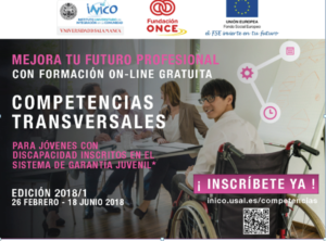 Curso online Competencias Transversales para la mejora de la empleabilidad de jóvenes con discapacidad, organizado, impartido y certificado por el Instituto Universitario de Integración en la Comunidad de la Universidad de Salamanca, y financiado por la Fundación ONCE para la Cooperación e Inclusión Social de Personas con Discapacidad y el Fondo Social Europeo y dirigido a jóvenes con discapacidad inscritos en el Sistema Nacional de Garantía Juvenil.