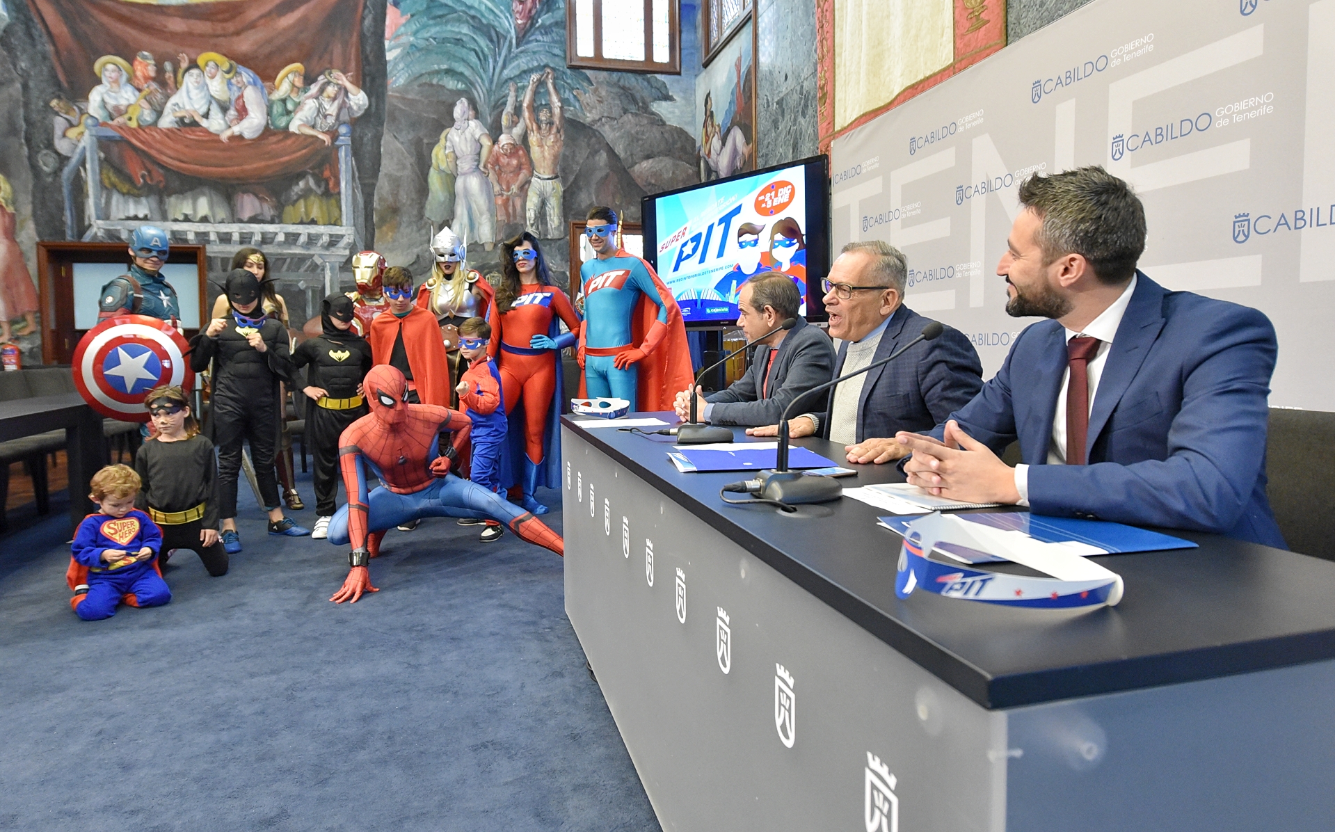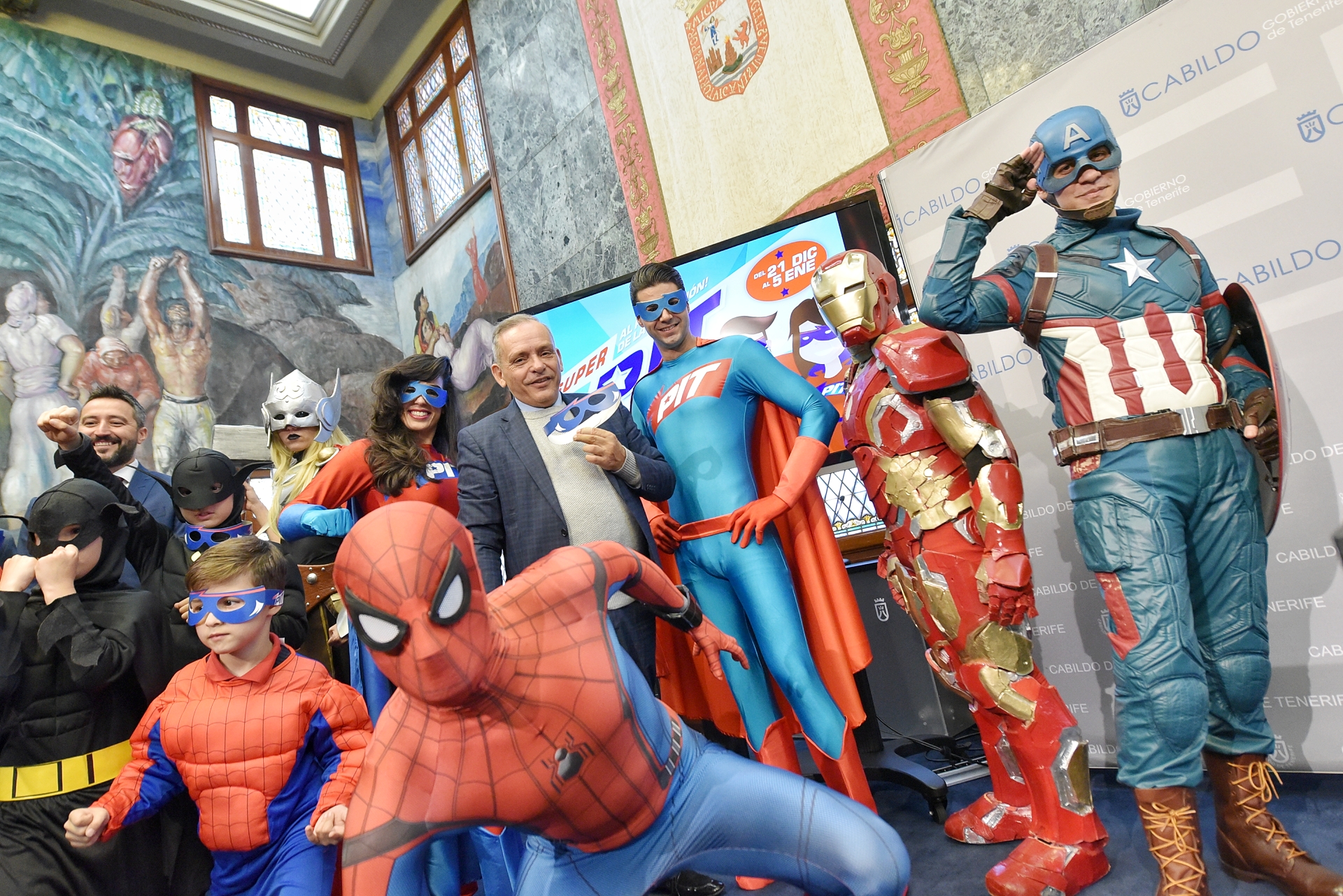 Efraín Medina, que estuvo acompañado por un grupo de superhéroes niños y adultos, comenzó la presentación ante los medios de comunicación dando paso a un video en el que un extraño personaje informa de que ha robado la diversión. Tras ello, instó a los presentes a que protegieran la diversión. De igual modo, animó a todas las familias a acudir al PIT, “pues se trata de un acontecimiento que genera desarrollo económico y empleo en la Isla”, y apuntó que los días 21 y 22, habrá un precio familiar de 5 euros por persona (frente a los 9 que cuesta la entrada el resto de días).
