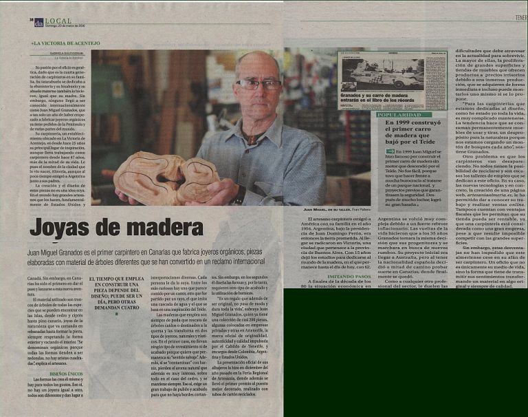 Juan Miguel Granados reside y trabaja en el norte de  Tenerife, concretamente en el municipio de la Victoria de Acentejo, cuenta desde hace muchos años, con el carné de artesano expedido por el Cabildo Insular de Tenerife, en la doble especialidad de carpintería y torneado. Este artesano aplica como nadie las nuevas tecnologías y la comunicación a través de las redes sociales, y es consciente de que estas plataformas, como facebook o youtube, son un escaparate para la artesanía y un vehículo perfecto para establecer una conexión con los internautas que pueden ser posibles clientes. Por ello, parte de su tiempo, lo dedica a interactuar con sus seguidores y a actualizar sus contenidos en los diferentes canales.