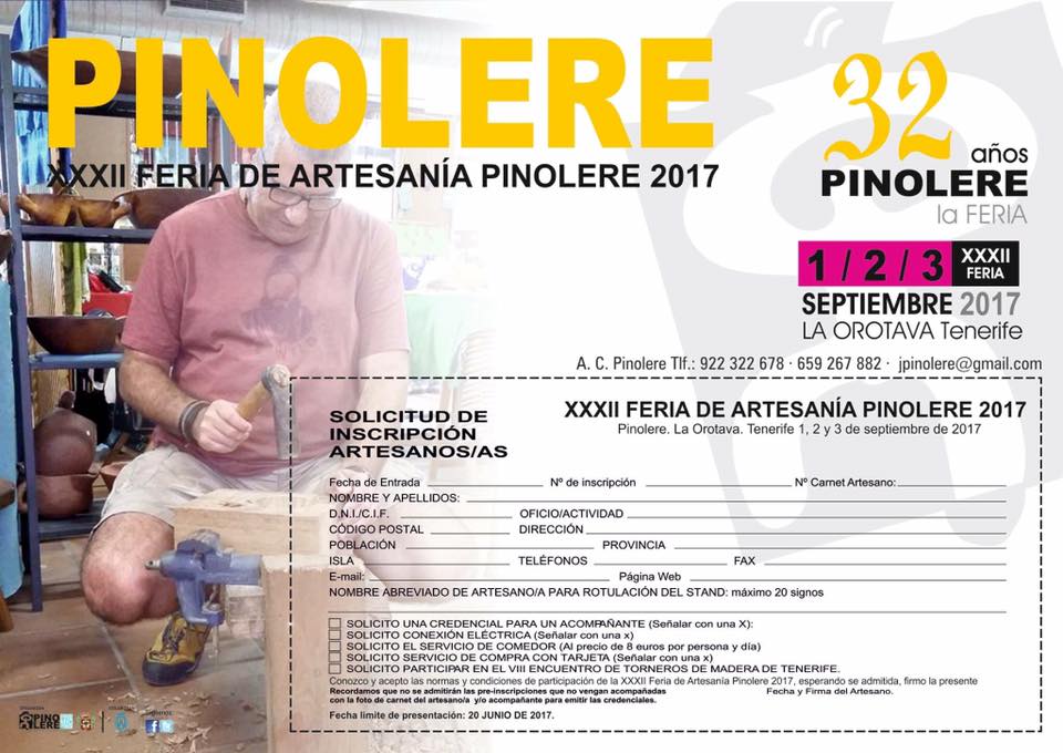 La XXXII edición de la Feria de Artesanía Pinolere 2017 se celebra del 1 al 3  de septiembre, en el Parque Etnográfico de Pinolere, organizada por la Asociación Cultural Pinolere “Proyecto Cultural”, con la colaboración del Ayuntamiento de la Villa de La Orotava y el Cabildo Insular de Tenerife.