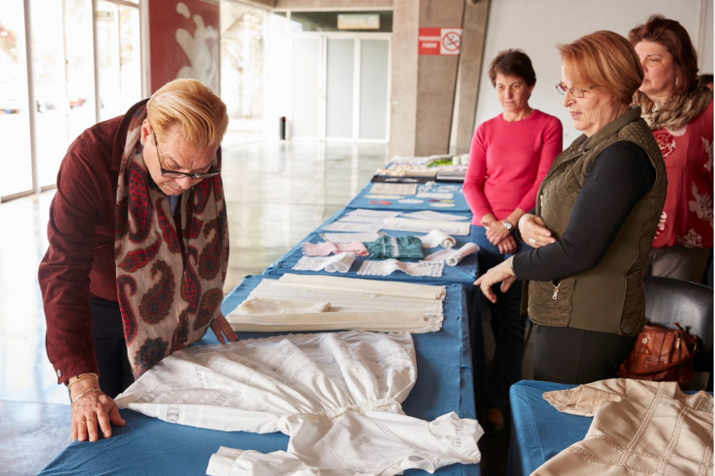 João Rôlo muestra su interés por el tradicional calado de la roseta en un encuentro con artesanos de Tenerife