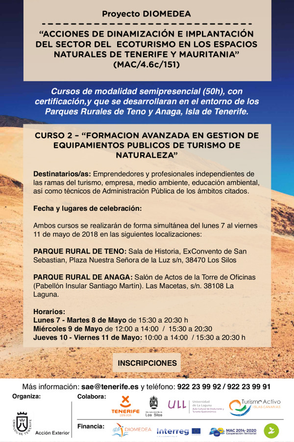 Curso: Formación Avanzada en Gestión de Equipamientos Públicos de Turismo de Naturaleza El Cabildo Insular de Tenerife, a través del Servicio Administrativo de Acción Exterior, ofrece esta...