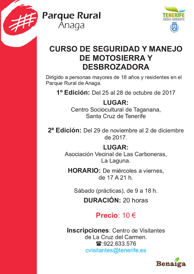 Curso: Seguridad y manejo de motosierra y desbrozadora Formación prevista en dos ediciones: plazas limitadas (18 personas por edición). Fechas previstas: Del 25 al 28 de octubre, en el Centro...